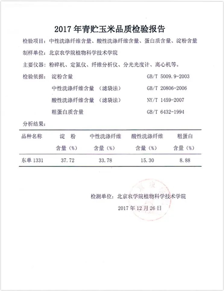 東單1331用于青貯產(chǎn)業(yè),糧飼通用品質(zhì)好,淀粉含量高達(dá)37.72,纖維、粗蛋白等含量合理。全株青貯,有65%的營(yíng)養(yǎng)來(lái)自于籽粒,10%來(lái)自于細(xì)胞內(nèi)含物,25%來(lái)自于消化纖維。青貯果穗一樣大,既能收草,也能收籽粒,是糧飼通用的大品種。